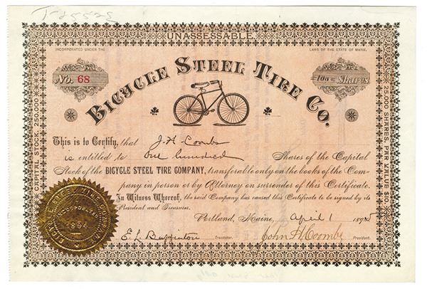Maine. 100 Shrs Stock Certificate. Issued. Uncancelled. Made out to J.H. Coombs, president of the company. Nice pictorial of bicycle. Very Fine +. (From the collection of John E. Herzog)