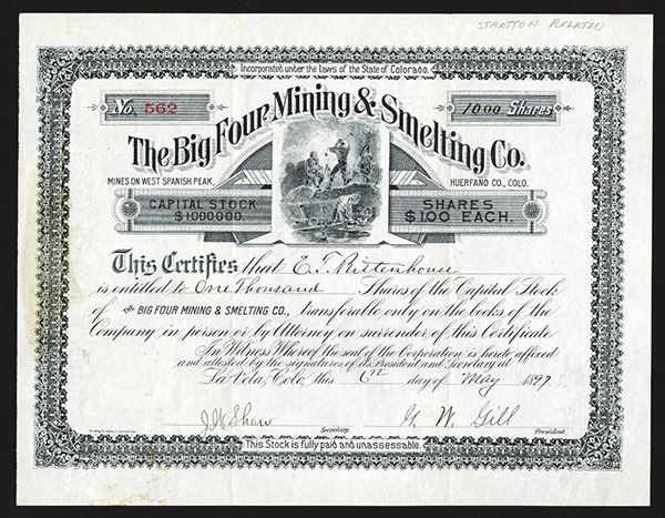 La Veta, Colorado. 1000 Shares, I/U, Black with miners working under title, VF with mounting remnant on left, Mines located at West Spanish Peak, Huerfano Co., CO. The West Spanish Peak district was located on the slopes of the peak by this name. Minor light staining at left edge and bottom.