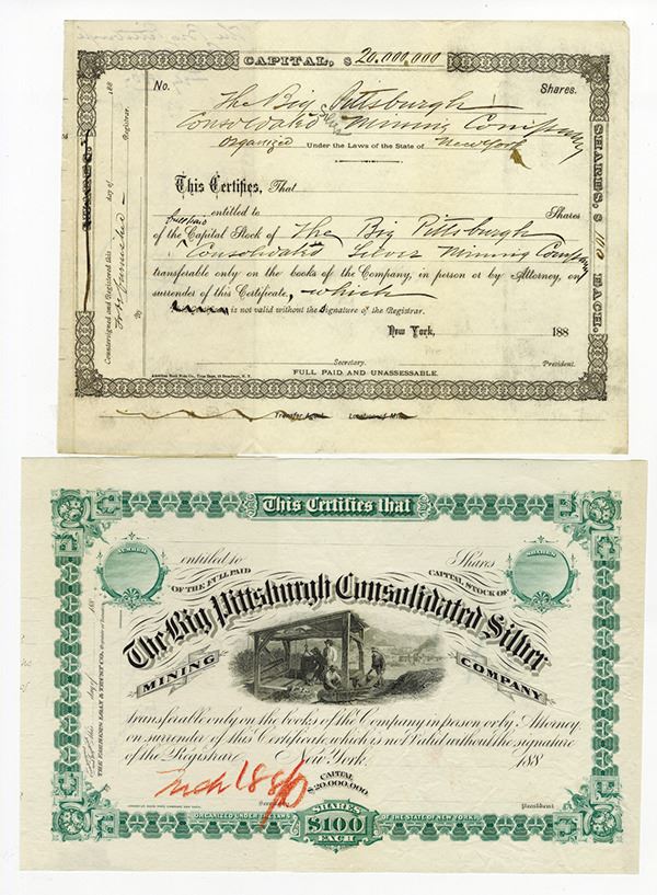 New York. Odd Shares Capitol Stock Proof Certificate. Black print with a green border. Vignette of men around a well lifting silver and rubble out of a mine. Red crayon writing at bottom left corner. Fine condition. ABNC.