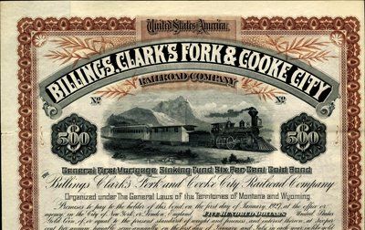 Montana and Wyoming Territory. 1887. $500. Specimen General 1st Mortgage 6% Gold Bond. Brown border. Speeding passenger train on top and miners working in mine on bottom. VF condition. Coupons attached. POC's.. Rare and attractive bond. FBNC.