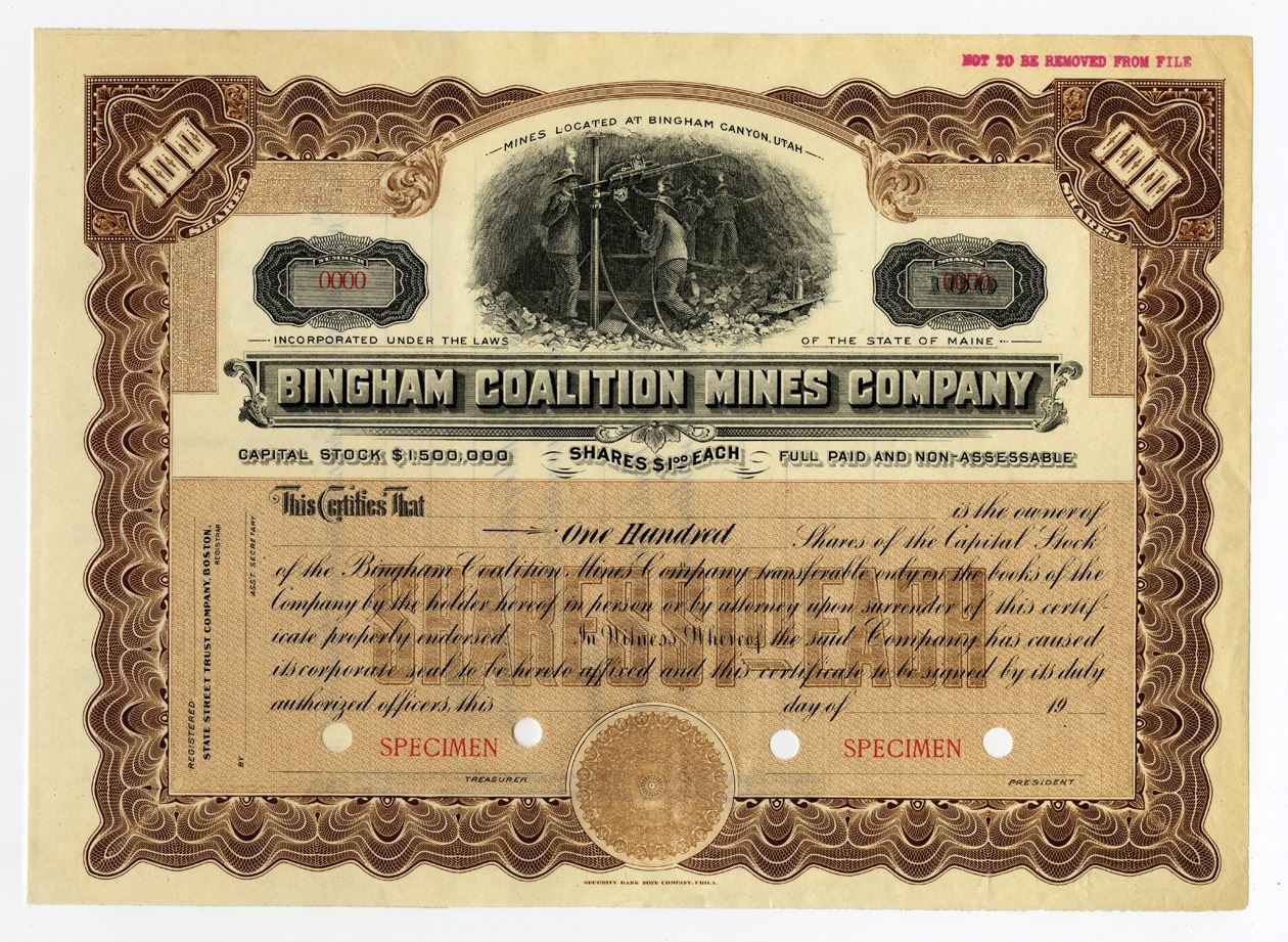 Mines Located at Bingham Canyon, Utah. Maine & Bingham Canyon, Utah. 100 Shares Capital Stock Specimen Certificate, Black print with brown border and underprint. "NOT TO BE REMOVED FROM FILE" stamp in top right corner, S/N 0000, Specimen overprints and POCs, SBNC.