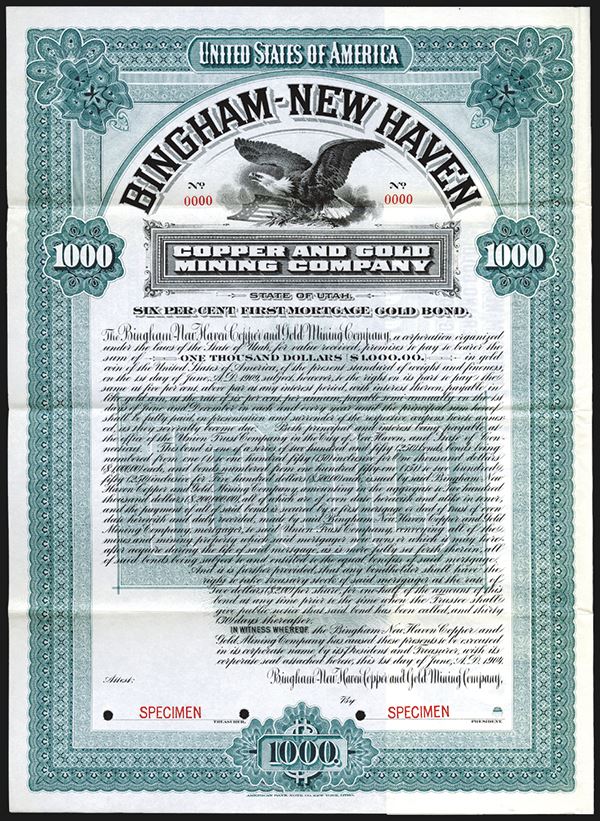 Utah. $1000 Specimen 6% Gold Coupon Bond. Black on green border, Screaming eagle top, Specimen overprint, POC's. ABNC.