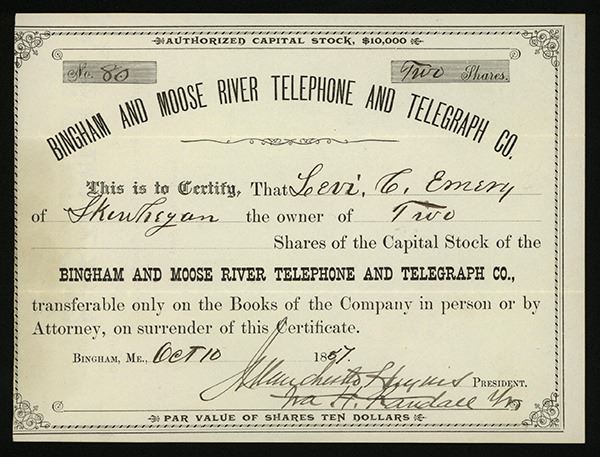 Maine. 2 Shares Capitol Stock Issued and Uncanceled Certificate. Black print with a simple black border. No vignette, very simple certificate. XF condition.