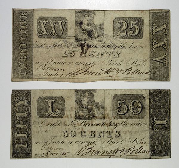 Paterson, NJ. Lot of 2 Notes, Includes 25 cents, 50 cents, Nov. 1, 1837, March 1, 1838. One appears to have an advertisement printed on the back. Choice Fine. (2)