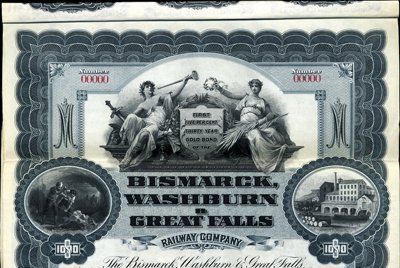 North Dokota. 1900. $1,000. Specimen 1st Mortgage 5% Gold Bond. Light brown border. Allegorical man and woman on top flank shield with miners at left and building with canal and barge on right. Red specimen overprints, POC's and "00000" serial numbers. Coupons attached. Unlisted railroad in Cox. Rare certificate. ABNC.