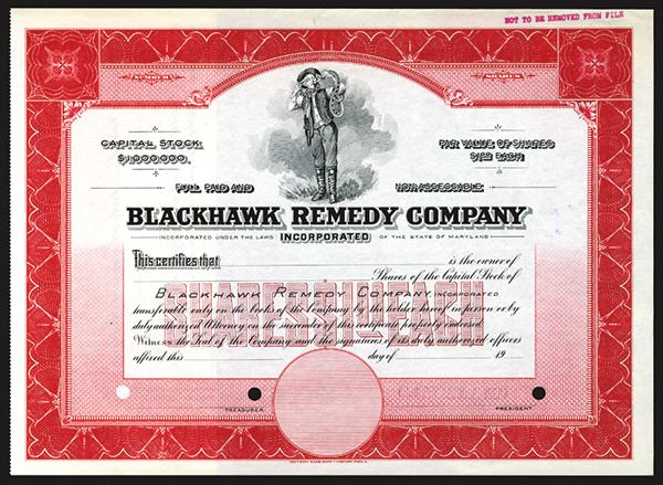 Maryland, Odd Shares, Specimen stock certificate, red border with unique vignette of man dressed as cowboy holding two rattlesnakes. POC's and archival hand stamp on upper right margin "Not to be removed from file". Rare topic and very attractive. Maybe he was selling "Snake Oil". SBNC. The BlackHawk Indian Remedy Company has been around since the early 1900's. At one time it was a "Mail Order " company that shipped coast to coast offering natural remedies.