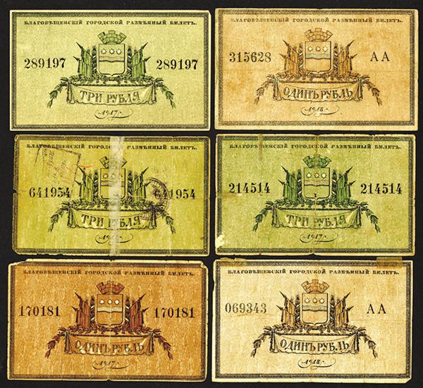 Amur Region, Russia. Lot of 6 notes, Includes 1 Ruble, 1917 (1) and 1918 (2), Fine to VF, R-6336; and 3 Rubles, 1917 (2) and 1918 (3), Fine to VF, scarce group. (The Pogrebetsky Family Archives)