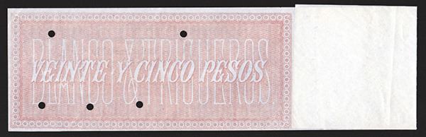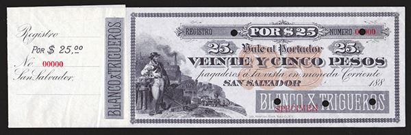San Salvador, 188x, 25 Pesos, P-UNL., Black on light orange underprint, Specimen overprints, POC's, sailor overlooking railroad and factories on left, counterfoil on left side. Rare Private issue. AU-Uncirculated. ABNC.