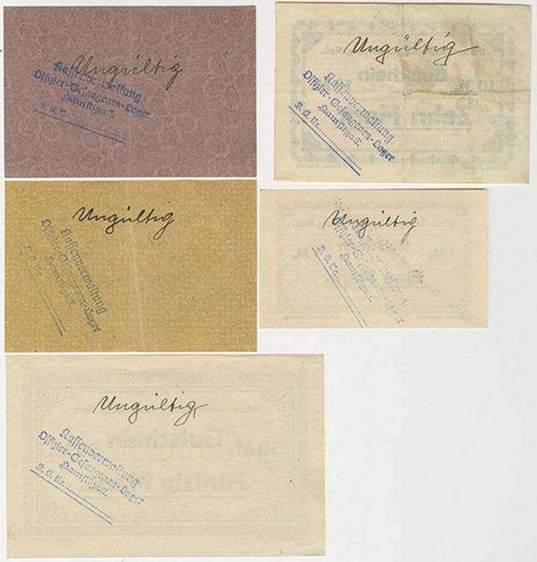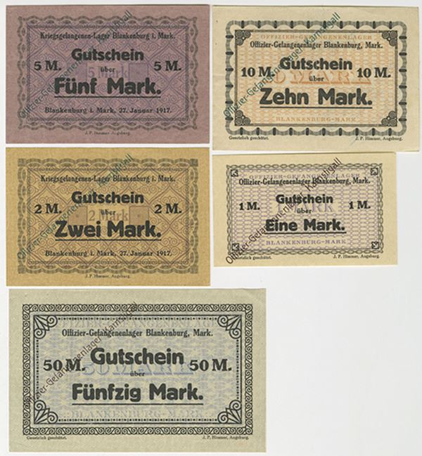 Germany. Lot of 5 Officer, Prisoner of War camp money includes 50 Mark; 10 Mark; 5 Mark; 2 Mark; and 1 Mark. Handstamp and hand cancellation on back, uniface otherwise. All in About to Choice Unc condition. (5)