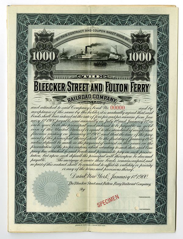 New York. $1000 Specimen 4% 1st Mortgage Gold Extended Coupon Bond, Black print on blue border and under tint on small sized certificate, Boat out on water at top, Specimen overprints and POC's, VF-XF condition, ABNC.