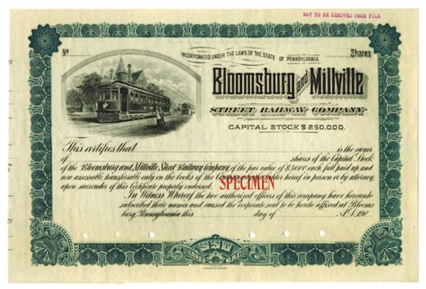 Pennsylvania. Odd Shares Capital Stock Specimen Certificate, Black print on green border, Small image of street car at top left corner, Specimen overprints and POC's, Fine-VF condition, SBNC. This is the only stock or bond found for this line in Cox. This is the second of 3 found in the ABN archives in 2005. Rare to say the least. SBNC.
