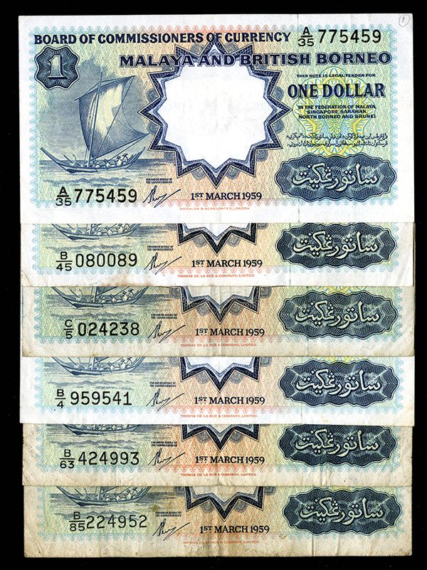 Board Commissioners of Currency, 1959, Quintet of 1 Dollar Notes Malaya & British Borneo, lot of 5 issued banknotes of 1 Dollar, 1959. One is P-8 printed by W&S, choice VF; the rest P-8A printed by TDLR, F-VF.