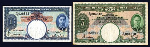 Lot of 2 notes, Includes $1 and $5, P-11 and P-12, both issued, Both VF to VF+ condition, The $5 has a low serial number B/72 004818. Attractive pair. W&S.