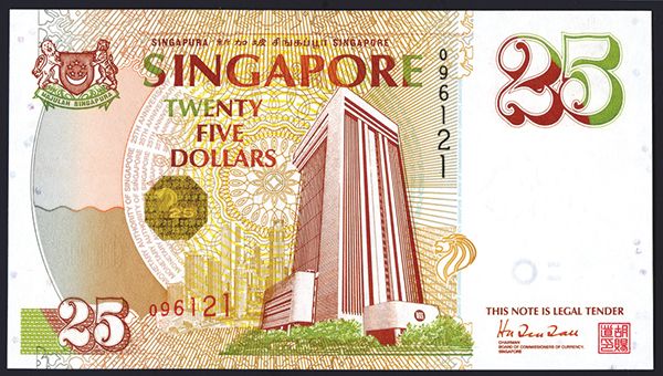 Singapore, Pick #33. Issued banknote, 25th Anniversary commemorative for the Monetary Authority. Modern skyline on back. PMG graded Gem Uncirculated 65 EPQ, Scarce note in this exceptional grade.