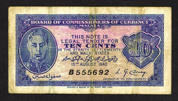 Malaya. 10 Cents. P-2. George VI at left end. Very Good to Fine, dirty. Scarce none-the-less. (The Silicon Valley Collection)