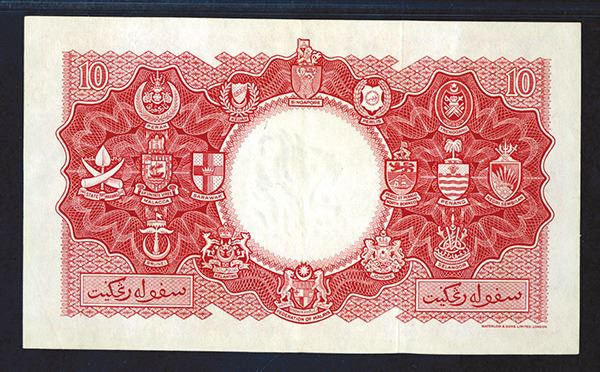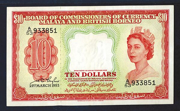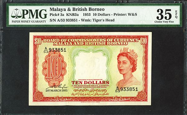 Malaya, 21st March, 1953, $10, P-3a, KNB3a, Issued banknote, Red on m/c, Queen Elizabeth II on Right, back red, Tiger's Head watermark, S/N A/53 933851, PMG graded Choice Very Fine 35 EPQ (Exceptional Paper Quality) with a couple light folds keeping this from Choice XF-AU. BWC.
