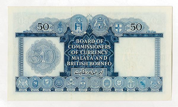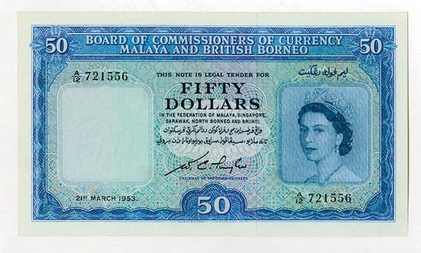 Malaya and British Borneo. $50, P-4b, Issued banknote, Blue and green, Queen Elizabeth II at right, back blue, S/N A/12 721556, Crisp Choice VF with sharp corners, bright colors and firm paper body, Attractive note for grade. W&S.