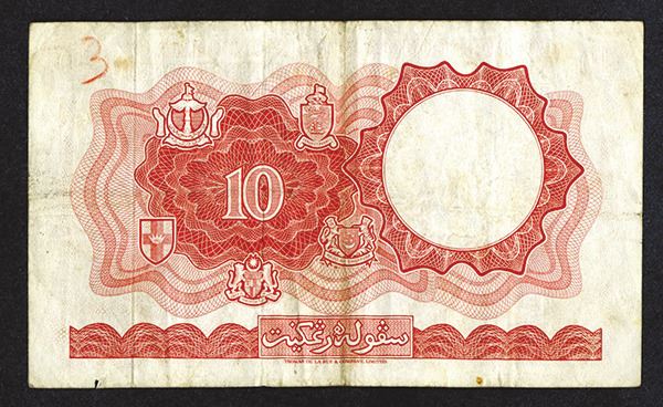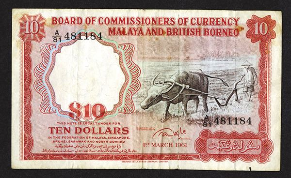 Malaya and British Borneo. 10 Dollars. P-9a. Oxen plowing at right. Small serial #. Choice Fine to VF, crayon # graffiti on back, stain or two. (The Silicon Valley Collection)