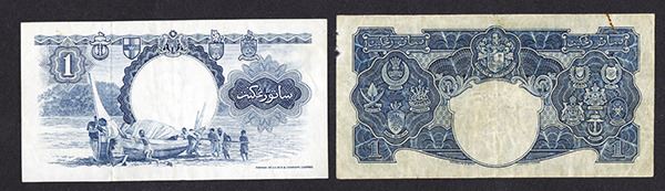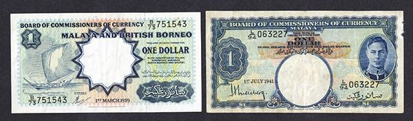Malaya. 1 Dollar P-11. George VI at right. Paper loss at right, rust on back; Malaya & British Borneo. 1 Dollar. P-8a. Both Very Fine. 2 pieces.