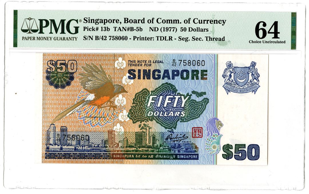 Singapore. ND (1977). 50 Dollars, P-13b, TAN#B-5b, issued banknote, segmented security thread, PMG Graded Choice Uncirculated 64 , TDLR.