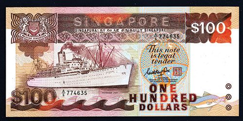 Singapore, $100, P-23a KNB31a, Issued banknote, S/N A/6 774635, PMG graded Gem Uncirculated 66 EPQ (Exceptional Paper Quality), 10 graded by PMG with 2 notes graded at this level and also the highest graded.