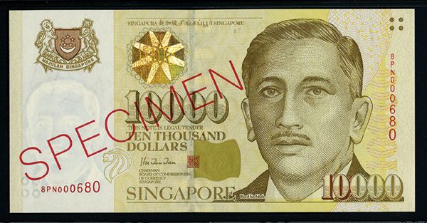 Singapore, ND (1999), $10,000, P-44s KNB42c, Specimen banknote, Light brown and m/c with gold foil hologram on top left middle, portrait of Yusof bin Ishak on right, back with technology vignette of computer chip research, red SPECIMEN overprint, S/N 8PN000680, PMG graded Gem Uncirculated 66 EPQ, extremely attractive note.