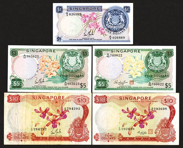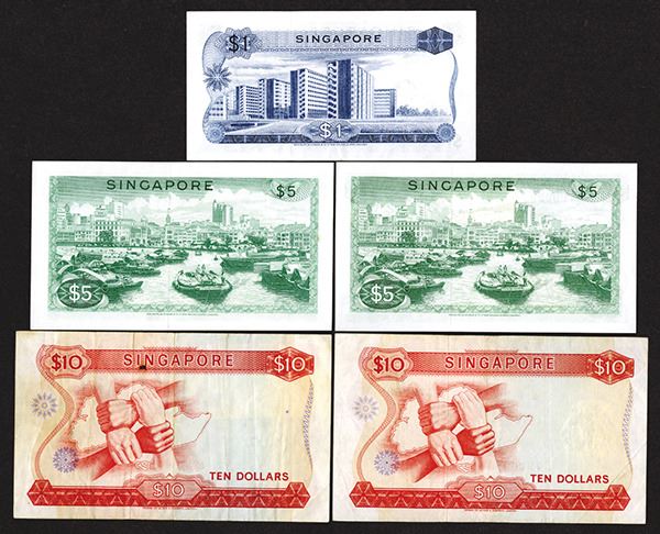 Singapore. 1, 5, 10 Dollars. P-1a; 2a, d; 3a, d. The 10 Dollar notes are Very Fine. The first three are Choice Uncirculated. 5 pieces.
