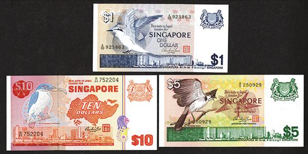 Singapore. 1, 5, 10 Dollars. P-9, 10, 11a. Native birds at left on all. All Choice Uncirculated. 3 pieces. (The Silicon Valley Collection)