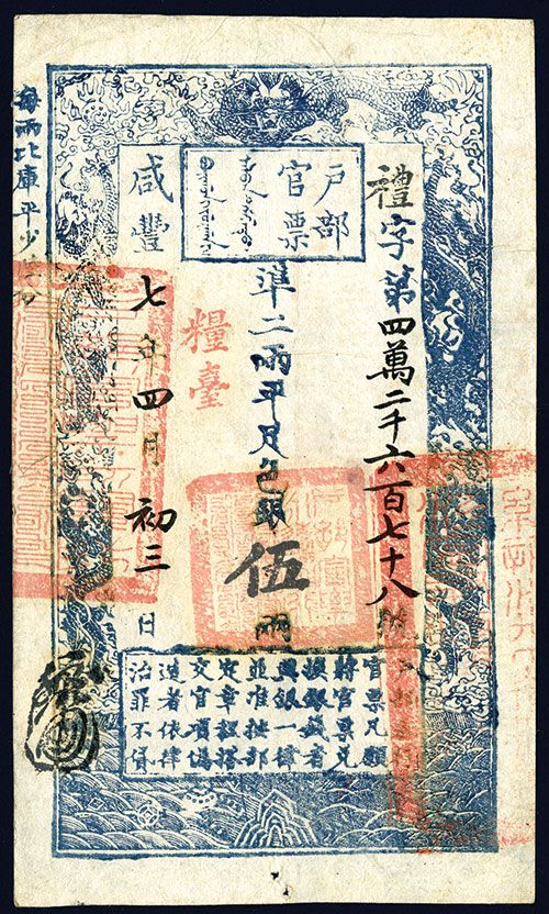 (Year 7), 1857, 5 Taels, P-A11e (S/M#H176-41), Issued, The usual Spindle holes on top margin, S/N 42678, Choice VF and very attractive.