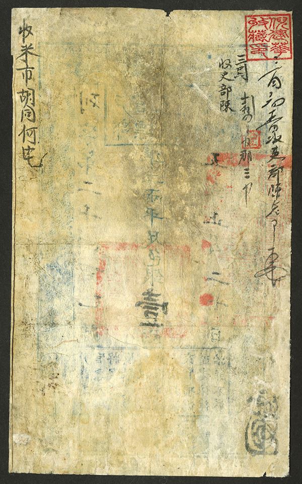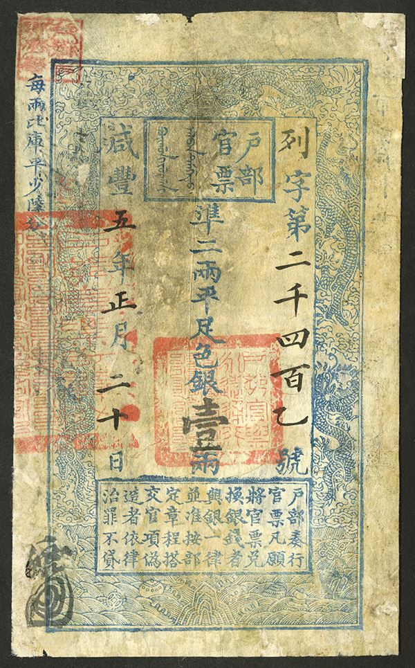 China. (Year 5), 1855, 1 Tael, P-A9c (S/M#H176-20), Issued, The usual Spindle holes on top margin, Fine to Choice Fine condition with light staining, rare note in any condition.