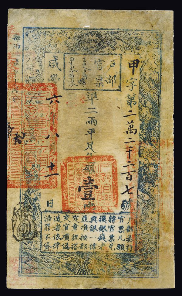 China. (Year 6), 1856, 1 Tael, P-A9d (S/M#H176-30), Issued, The usual Spindle holes on top margin, Fine to Choice Fine condition with light staining, rare note in any condition.