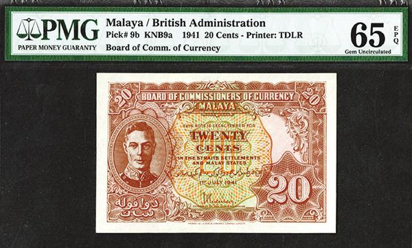 Malaya, 1941, 20 cents, P-9b, KNB9a, King George VI on left. Brown on m/c, PMG graded Gem Uncirculated 65 EPQ. TDLR.