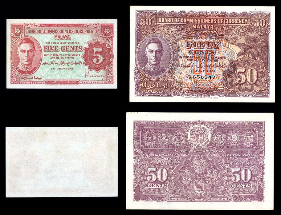 Malaya, 1941, Lot of 2 notes, both with King George VI on left. Includes 5 Cents, P-7b, red and light green underprint, PMG graded Gem Uncirculated 66 EPQ and 50 Cents, P-10a, violet on orange and blue underprint, PMG graded About Uncirculated 50. TDLR.