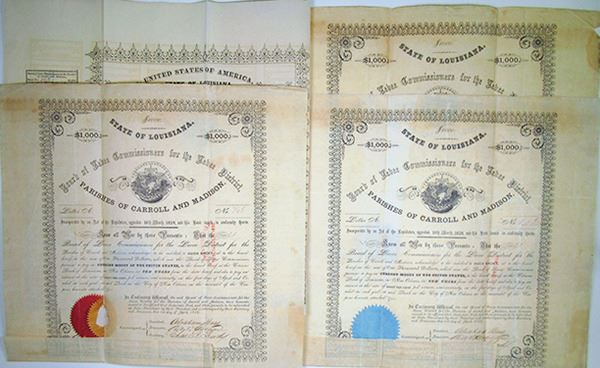 Louisiana. Lot of (4) Four $1,000 Issued 8% Coupon Bonds, all have state seal of Louisiana at top between company title and are in Fine-VF condition, Includes three 1859 bonds with coupons on bottom, 2 with extra coupon sheet and post war 1867 bond that appears similar but there are coupons on the left, right and bottom. Scarce pre and post Civil War Louisiana bonds.