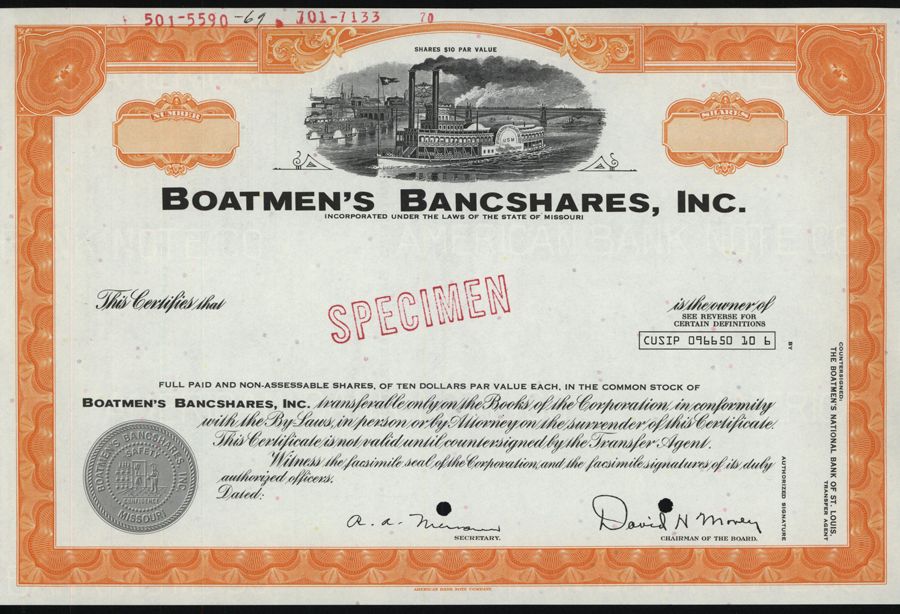Missouri, 1969, Specimen Stock, Odd Shares, Black on orange border and underprint, Vignette of the St. Louis & New Orleans Packet steamship near city harbor with long bridge in background, POC's, VF-XF condition, ABNC.