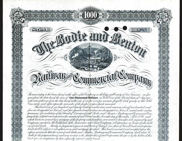 Bodie Mining District, California, 1886, $1000 Issued bond, POC's, VF.
