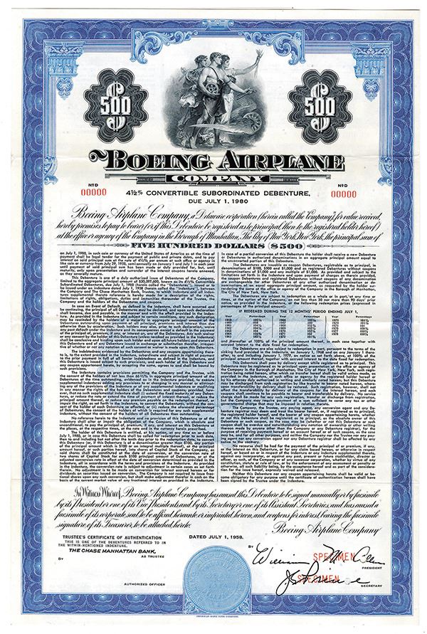 Washington. California. $500 Specimen 4 1/2% Convertible Subordinated Debenture Coupon Bond, Black print on blue border and under tint, Group of allegorical figures together at top, Specimen overprint and POC's, VF-XF condition, ABNC.