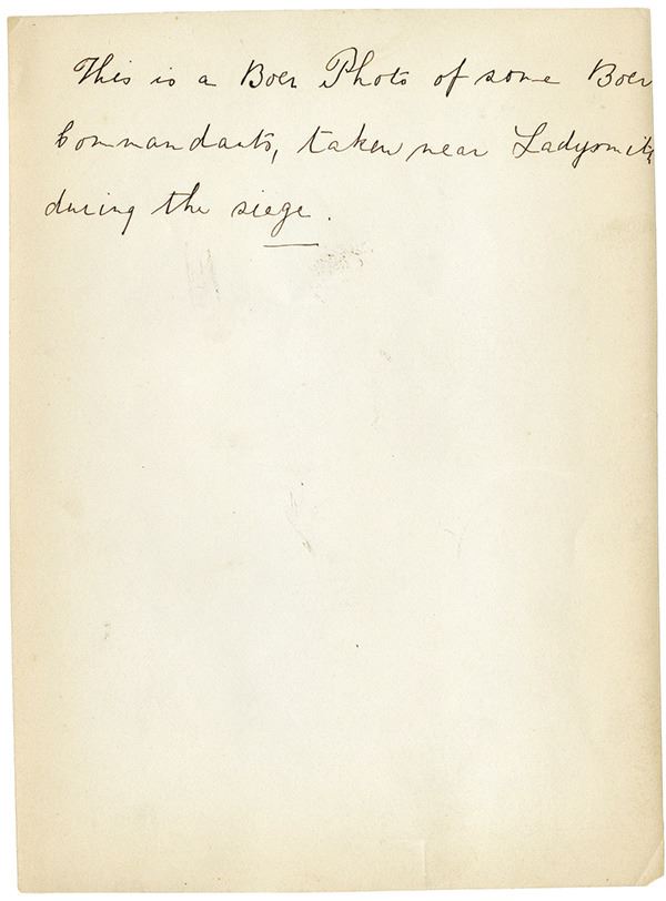 South Africa, March 1900, 10s (10 Shillings), P-S654b, Issued banknote, Green, Man with machine gun at left and cannon at right, S/N 737, VF condition with a 1mm piece of the upper left corner tip missing, otherwise very attractive for the grade. Printer: Townshend & Sons. Also included is a real photograph of 18 fierce looking Boer Guerrilla Fighters with weapons posing for the camera. The back of the photo has handwritten note "This is a Boer Photo of some Boer Commandants, taken near Ladysmith during the siege.