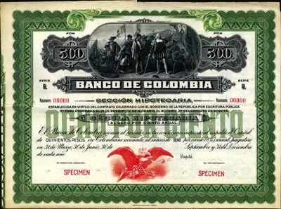 (ca.1919), Series C. P-S397 Unlisted. 500 Pesos Specimen. Green border, Series C. Unlisted denomination and color in Pick. Red specimen overprint, POC and "00000" serial numbers. Coupons attached. Impressive vignette of "Landing of Columbus" measuring 4 5/8ths by 2 1/8th inches and red eagle on bottom. Coupons attached. AU condition with horizontal fold in middle where it was folded when made as well as minor splits and a small piece missing from the upper left corner as well as paper toning on top margin. Rare note. ABNC.