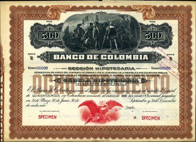 (ca.1919), Series H. P-S397 Unlisted. 500 Pesos Specimen. Brown border, Series H. Unlisted denomination and color in Pick. Red specimen overprint, POC and "00000" serial numbers. Coupons attached. Impressive vignette of "Landing of Columbus" measuring 4 5/8ths by 2 1/8th inches and red eagle on bottom. Coupons attached. AU condition with horizontal fold in middle where it was folded when made as well as minor splits and a small piece missing from the upper left corner as well as paper toning on top margin. Rare note. ABNC.