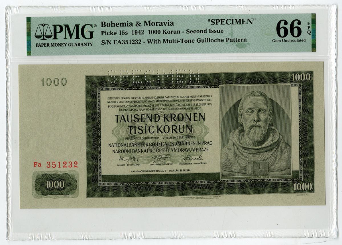 Bohemia & Moravia, 1942. 1000 Korun, P-15s, Specimen Banknote, Dark green with portrait of P. Parler at right, Back m/c guilloche, S/N FA351232, Pin punched Specimen at top, PMG graded Gem Uncirculated 66 EPQ. Only 2 notes out of 49 grade 1 increment higher,