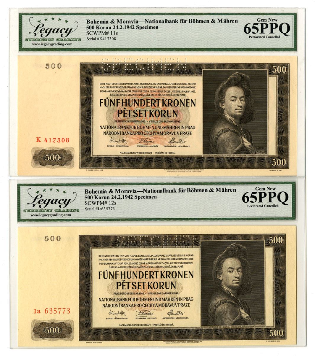Bohemia & Moravia, 1942. Lot of 2 Specimen Banknotes, Includes: 500 Korun, P-11s, Dark brown on m/c underprint with portrait of P. Brandl at right, Back is olive and red, S/N K417308; 500 Korun, P-12s, Dark brown on m/c underprint with portrait of P. Brandl at right, Back is olive and red with 'second issue' at left margin, S/N Ia635773. Both notes have Specimen punches and are Legacy graded Gem New 65PPQ. (2). Sold "AS IS" no returns accepted.