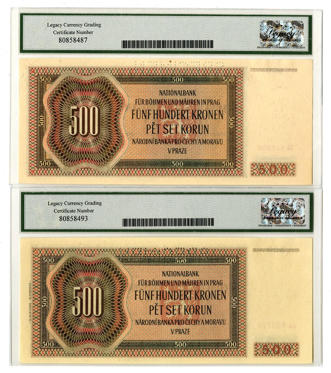 Bohemia & Moravia, 1942. Lot of 2 Specimen Banknotes, Includes: 500 Korun, P-11s, Dark brown on m/c underprint with portrait of P. Brandl at right, Back is olive and red, S/N K417308; 500 Korun, P-12s, Dark brown on m/c underprint with portrait of P. Brandl at right, Back is olive and red with 'second issue' at left margin, S/N Ia635773. Both notes have Specimen punches and are Legacy graded Gem New 65PPQ. (2). Sold "AS IS" no returns accepted.