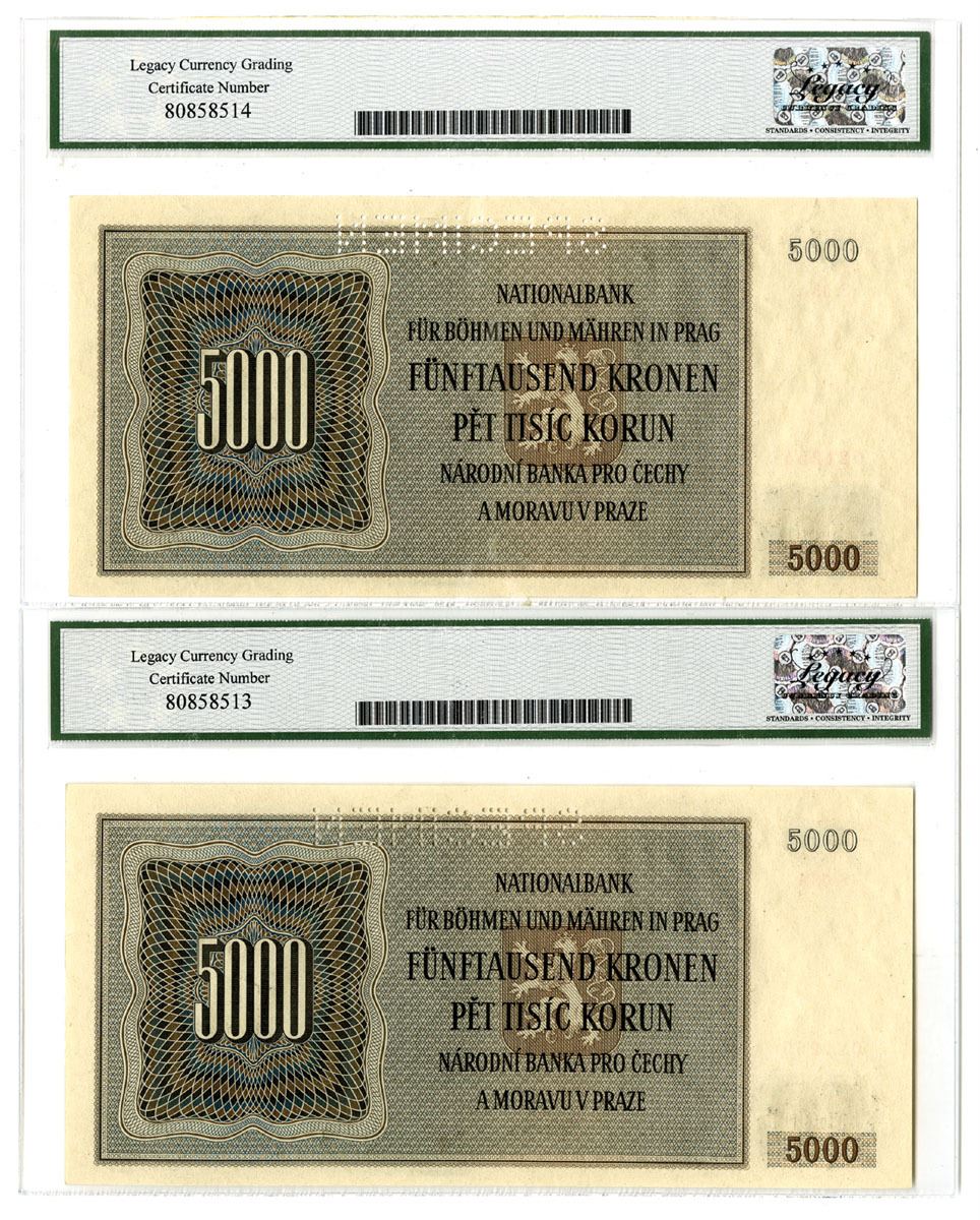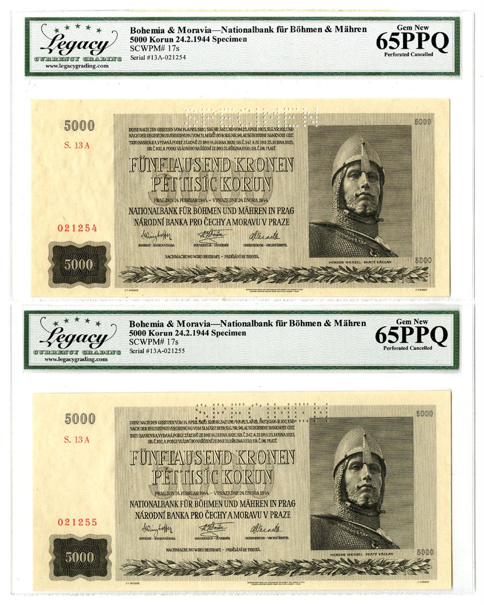 Bohemia & Moravia, 1944. 5000 Korun, P-17s (2), Sequential Specimen Banknote Pair, Gray print with portrait of Herzog Wenzal at right, Back is brown and m/c , Pin punched Specimen at top, S/Ns 13A-021254 and 13A-021255, Both are Legacy graded Gem New 65PPQ. (2). Sold "AS IS" no returns accepted.