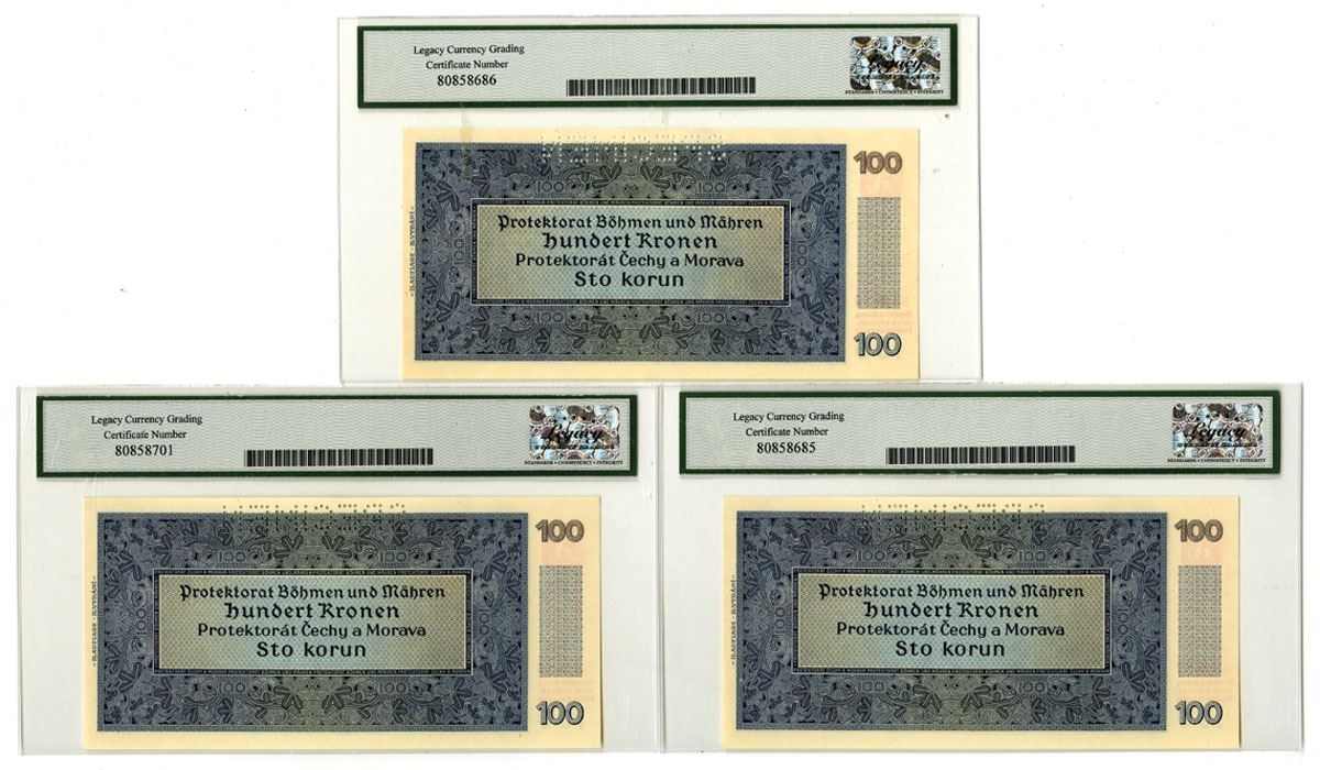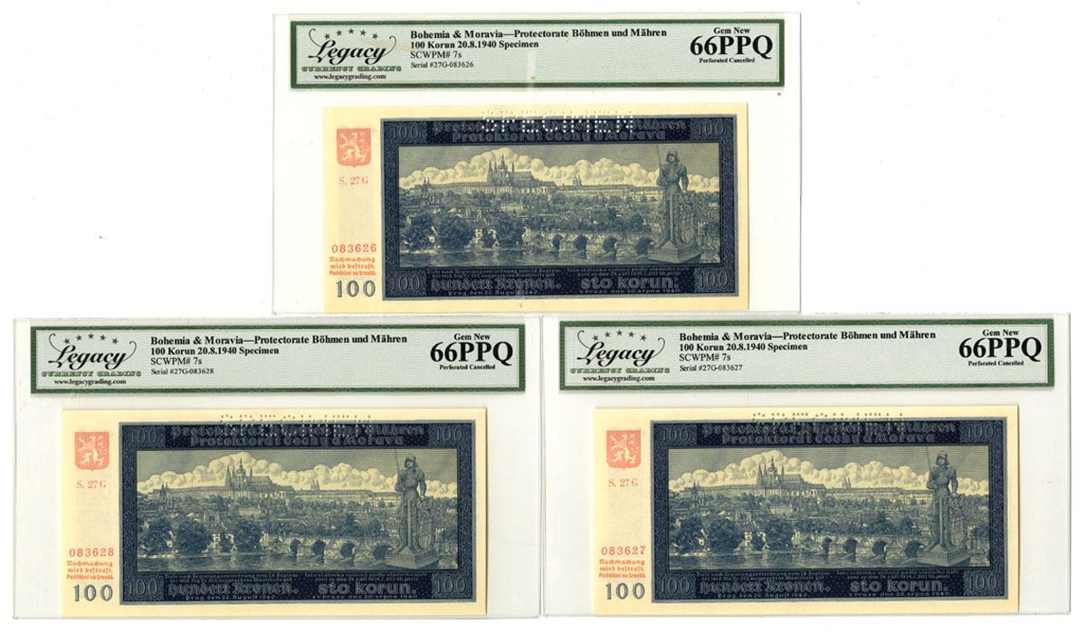 Bohemia & Moravia, 1940. 100 Korun, P-7s (3), Sequential Specimen Banknote Trio, Blue print with view of Castle and Charles Bridge in Prague, Back is blue center with blue lettering and second issued printed at left, Pin punched Specimen at top, S/Ns 27G-083626, 27G-083627, and 27G-083628, All are Legacy graded Gem New 66PPQ. (3). Sold "AS IS" no returns accepted.