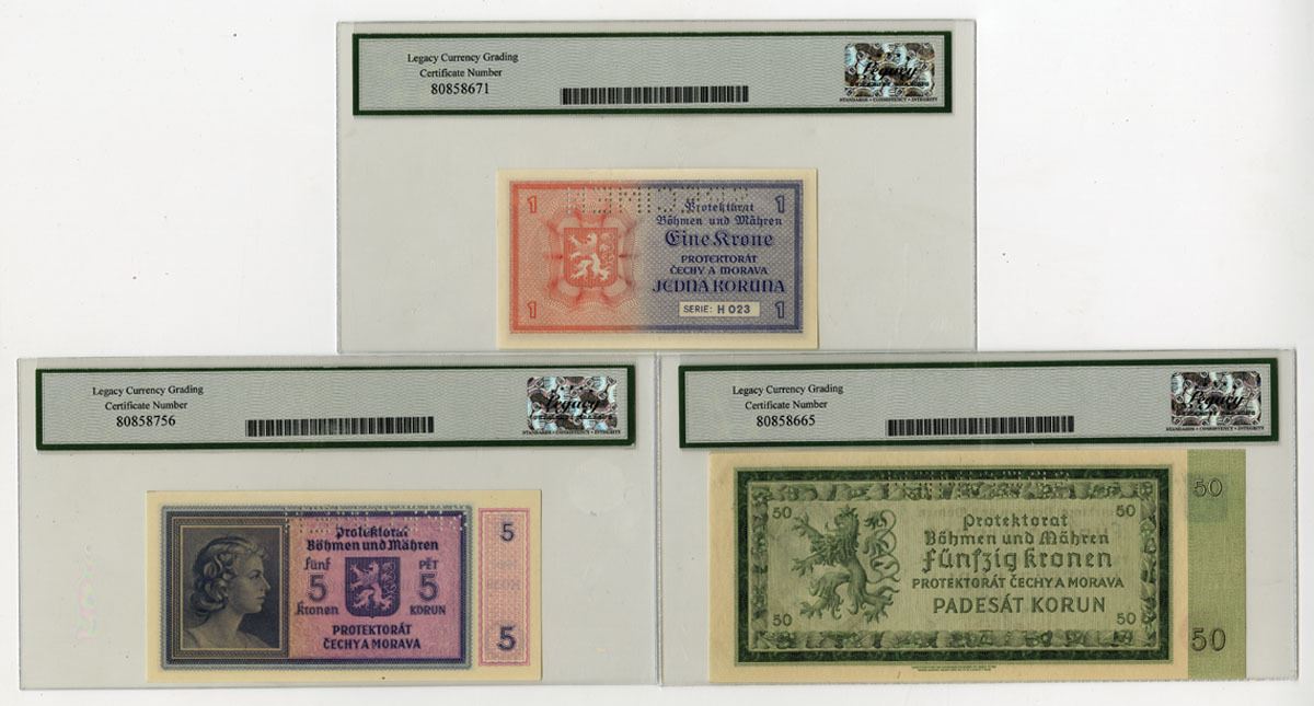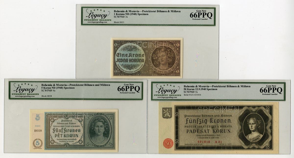 Bohemia & Moravia....., 1940. Lot of 3 Specimen Banknotes, Includes: 1 Koruna, P-3s, Block H023; 5 Korun, P-4s, Block H038, only 1 note grades higher in the PMG census; 50 Korun, P-5s, S/N A21 621816, only 2 notes grade higher in the PMG census. All notes are pin punched Specimen and Legacy graded Gem New 66PPQ. (3). Sold "AS IS" no returns accepted.