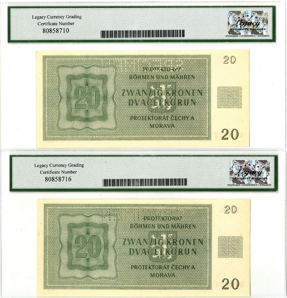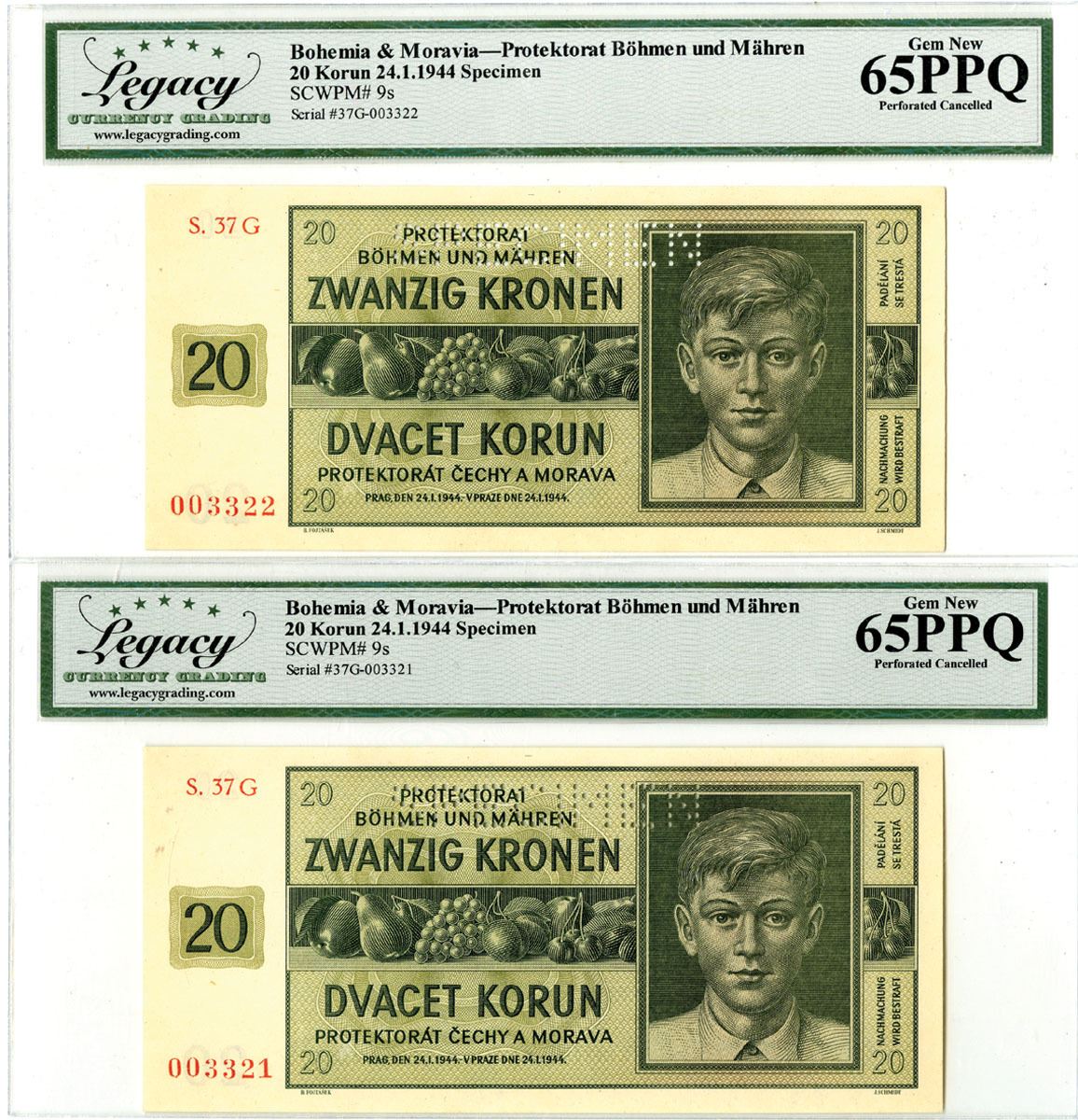 Bohemia & Moravia, 1944. 20 Korun, P-9s (2), Specimen Banknote Pair, Green on light green underprint with Fruit across center and portrait of a young boy at right, Back is green with arms in center as underprint, S/Ns 37G-003321 and 37G-003322, Both are Legacy graded Gem New 65PPQ. (2). Sold "AS IS" no returns accepted.