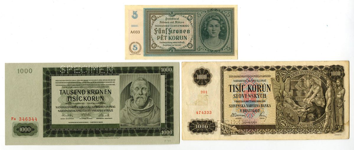Bohemia & Moravia and Slovakia, ND (1940)-1942. Lot of 3 Banknotes, Includes: Protectorate of Bohemia and Moravia -German Occupation WWII, ND (1940). 5 Korun, P-4a; National Bank of Bohemia and Moravia, 1942, 1000 Korun, P-14; Slovak National Bank, 1940, 1000 Korun, P-13s, Specimen Note. Notes range from VF to Choice VF condition. (3). Sold "AS IS" no returns accepted.