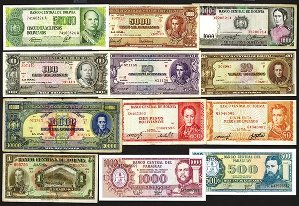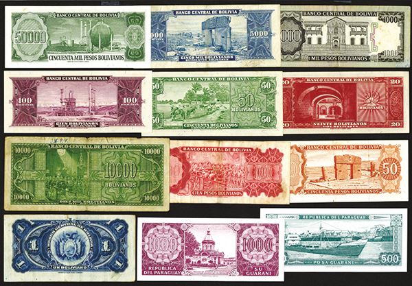 South America. Generally Fine to Uncirculated one with paper separation, some with paper soiling. 23 pieces.