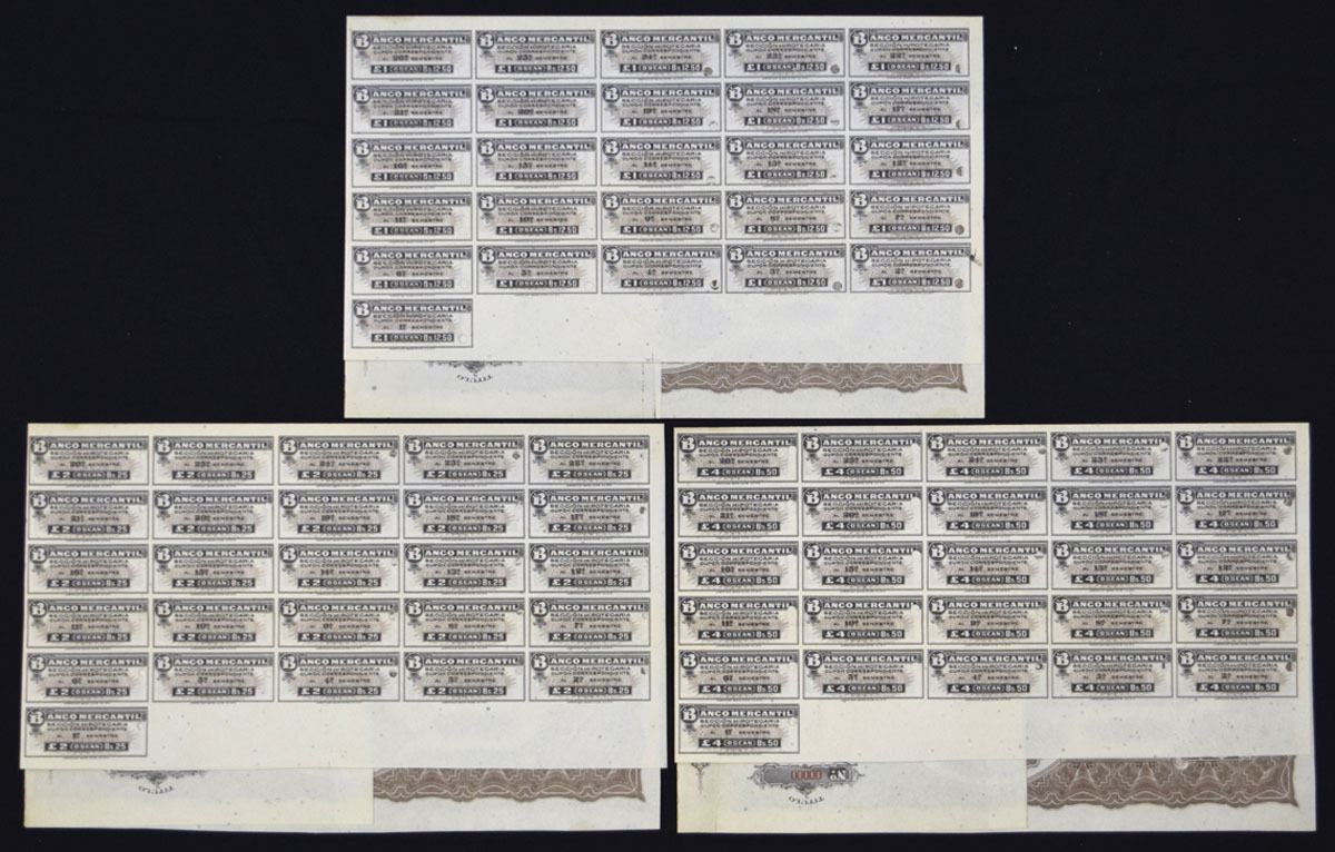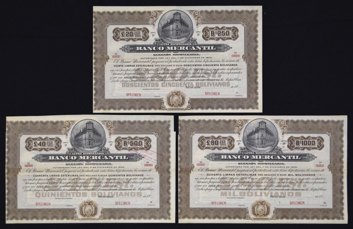 Oruro, Bolivia. Lot of 3 Specimen Bonds. 250 Bolivianos, 500 Bolivianos, and 1,000 Bolivianos all with brown border and under tint and large building vignette, Printed in Spanish, Specimen overprints with POC's. All are in VF to XF condition. ABNC. (3)